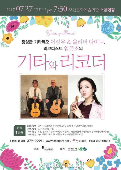 2017 오산문화예술회관 소극장 시리즈 공연의 두 번째 프로그램인 「기타와 리코더」는 남미와 유럽의 음악을 한국과 독일의 대표적인 기타리스트인 이성우와 올리버 파르타쉬 나이니 그리고 ‘리코더계의 아이돌’로 일컬어지는 리코디스트 염은초가 함께하는 아름답고 흥미로운 형식의 공연이다.