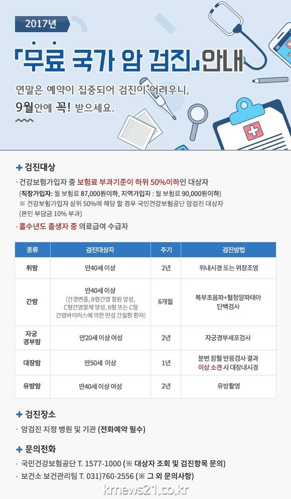 국가 암 검진대상자는 의료급여수급권자 및 건강보험 가입자 중 2016년 11월 기준 직장 8만9천원 지역 9만 원 이하 납부자가 해당되며 암 검진 비용은 무료이다. 건강보험납부액 상위 50% 대상자는 본인부담 10%만 부담하면 된다.