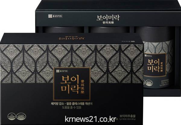 이러한 보이차의 효과를 제대로 보려면 하루에 갈산 35㎎을 섭취해야 한다. 종근당건강은 보이차 추출물이 든 건강기능식품 ‘보이미락’(사진)을 출시했다. 하루 1포(1g) 섭취로 보이차 33잔 분량에 든 갈산 35㎎을 섭취할 수 있다. 보이차 추출물은 식품의약품안전처로부터 ‘체지방 감소 및 혈중 콜레스테롤 개선에 도움을 줄 수 있음’이라는 기능성을 인증받았다.