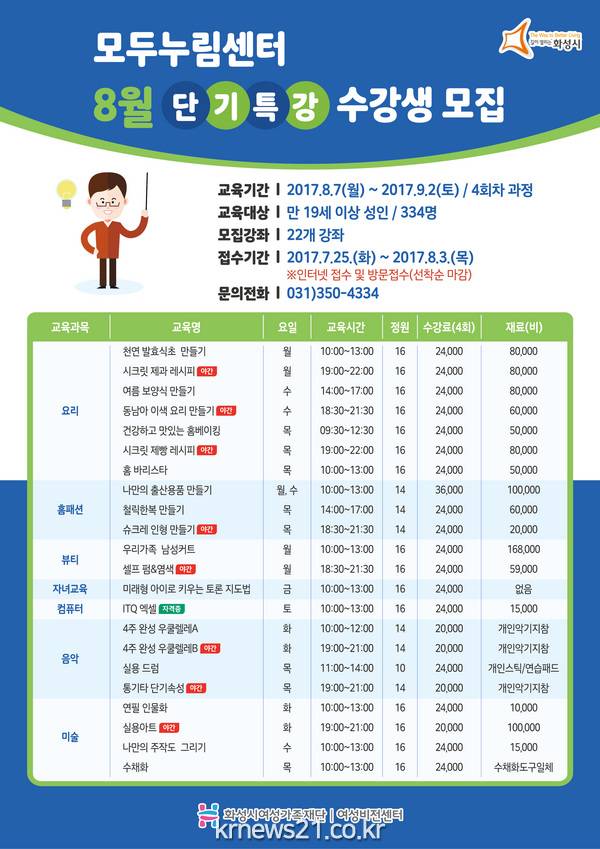 8월 여름방학 특강 수강생 모집과 관련한 자세한 사항은 화성시여성가족재단 여성비전센터(031-350-4334)로 문의하면 된다.