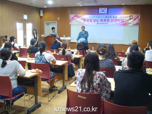 ‘황금알 낳는 똑똑한 건강비법’을 주제로 한 김 소장의 강의는 임신부와 태아를 위한 똑똑한 여름 식생활 건강법, 쾌식(快食), 쾌면(快眠), 쾌변(快便), 쾌욕(快浴), 쾌경(快經) 등 건강한 출산을 위한 ‘오쾌(五快) 건강법’, 무더위·피로·스트레스에 지친 몸을 지키는 여름철 건강 유지 비법 등으로 진행됐다.