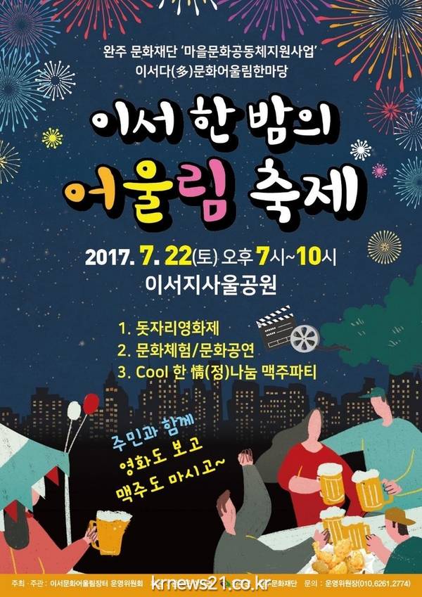 (재)완주문화재단(이사장 박성일)에서 진행한 마을문화공동체 발굴 및 지원 사업 열매분야에 선정된 ‘이서문화어울림장터’가 오는 22일 오후 7시 이서 지사울공원에서 ‘이서 다(多)문화어울림한마당’이라는 주제로 주민화합의 시간을 마련한다.