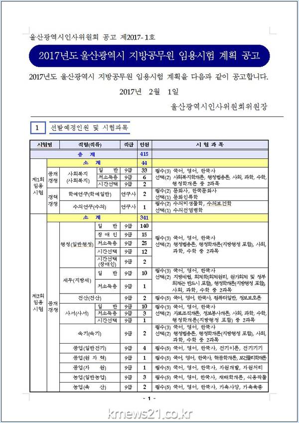 필기시험은 오는 9월 23일 실시되며, 필기시험 합격자 발표는 10월 19일, 면접시험은 11월 2일, 최종 합격자는 11월 14일 울산시 누리집(홈페이지) 시험정보란을 통해 발표할 예정이다.