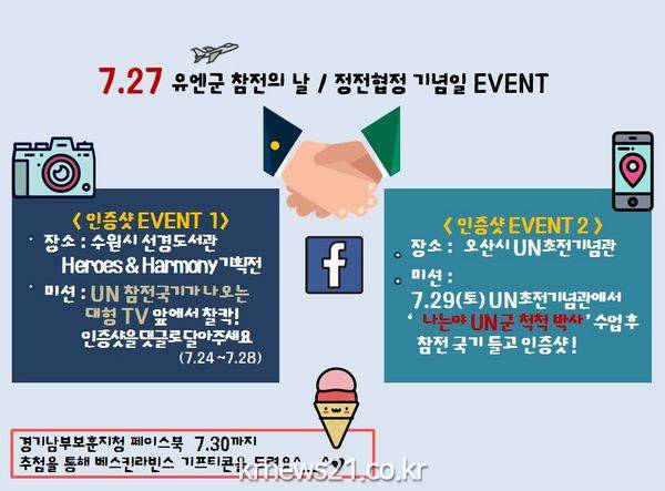 경기남부보훈지청(지청장 남창수)은 7월 27일 6.25전쟁 정전협정 및 유엔군 참전의 날 기념일을 맞이하여 명예선양의 일환으로 특별사진전 및 온라인 이벤트 등 다양한 행사를 준비하였다.