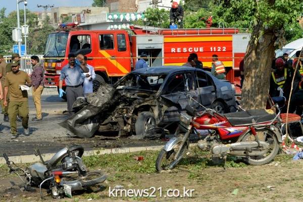 파키스탄 보안 관리들이 24일(현지시간) 라호르에서 발생한 자폭테러 현장을 조사하고 있다. 이날 테러는 경찰팀 인근에서 발생했으며 26명이 사망하고 54명이 다쳤다. 희생자들은 대부분 경찰관이다. 탈레반 관련 단체인 테릭-에-탈레반은 이번 사건이 자신들의 소행이라고 주장했다.
