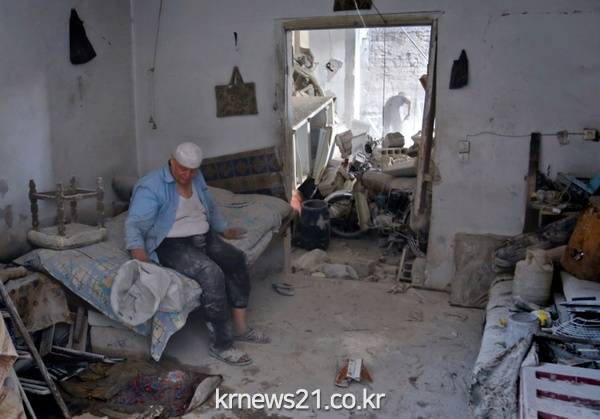 시리아 다마스쿠스 동부지역에서의 공습 뒤 자신의 집에 앉아있는 한 남성.