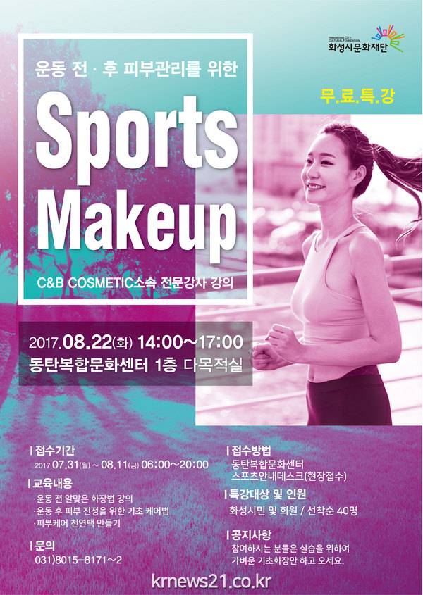 (재)화성시 문화재단 동탄센터 운영 팀의 주최로 더운 여름철, 운동전·후 피부 관리를 위한 스포츠 메이크업 특강을 8월22일(화) 동탄 복합 문화센터 1층 다목적실에서 실시한다. 스포츠시설 및 수영장을 운영 중인 동탄 복합 문화센터에서는 스포츠 강좌 외에도 지역민들의 건강관리와 운동 상식 등에 관한 무료특강을 주기적으로 개최하여 큰 호응을 얻고 있다.