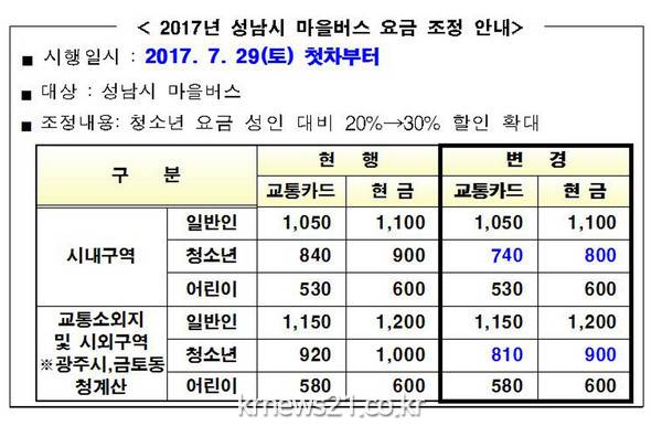 성남시(시장 이재명)는 오는 7월 29일부터 마을버스 청소년 요금을 현행 기준 100원 내리기로 했다.