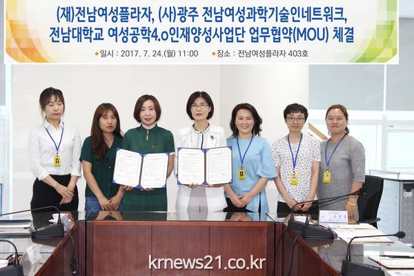 전남여성플라자는 (사)광주·전남여성과학기술인네트워크, 전남대학교 여성공학4.o인재양성사업단과 전남 여성과학기술인의 교류협력 및 네트워크 활성화를 위한 업무협약을 체결했다고 26일 밝혔다.