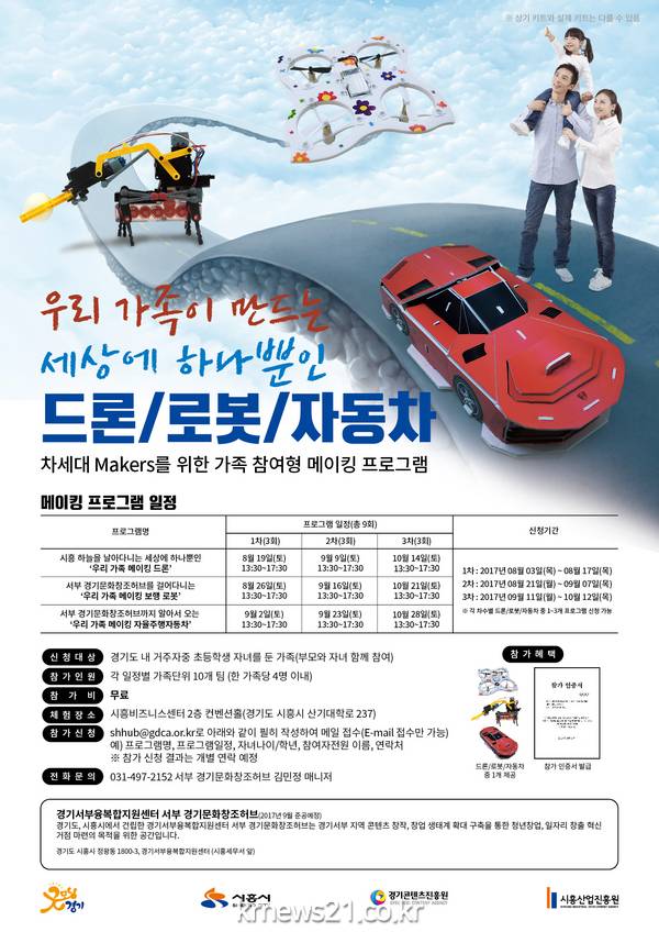 서부 허브가 새롭게 공개한 융·복합 메이킹 프로그램은 부모와 초등학생 자녀가 함께 참여하는 차세대 Makers를 위한 가족 참여형으로 진행한다. ‘시흥 하늘을 날아다니는 세상에 하나뿐인 우리 가족 메이킹 드론 (3회)’, ‘서부 경기 문화 창조허브를 걸어 다니는 우리 가족 메이킹 보행 로봇 (3회)’, ‘서부 경기 문화 창조허브까지 알아서 오는 우리 가족 메이킹 자율주행자동차 (3회)’ 등으로, 참가자에게는 드론·로봇·자동차 중 1개 장비를 제공하며 참가 인증서를 발급한다.