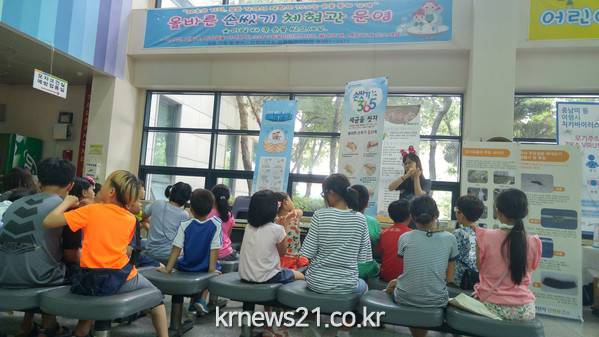 이어 2부 올바른 손 씻기 체험교실은 손 씻기 전과 후를 비교 체험을 통해 올바른 손 씻기의 중요성에 대해 학습한다.