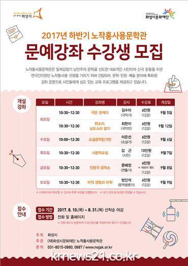 (재)화성시 문화재단(대표이사: 권영후) 노작홍사용문학관에서 2017년 하반기 문예강좌 수강생을 모집한다. 일제강점기 낭만주의 문학을 선도한 대표적인 시인이자 신극 운동을 이끈 연극인이었던 노작 홍사용 선생을 기리기 위해 건립된 노작홍사용문학관에서는 2010년 개관이래 각 분야의 전문가를 강사로 초빙하여 문학·인문·예술 분야에 특화된 문예 강좌를 지속적으로 운영하고 있다.