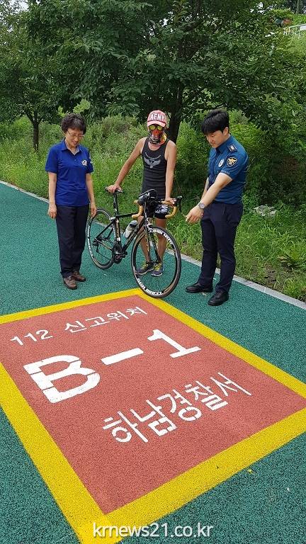 하남경찰서(서장 조상현)는 8월 8일 미사강변 자전거길 전용도로에 선동IC⇨팔당대교(10KM)간 긴급신고 위치 노면 표지를 설치했다.