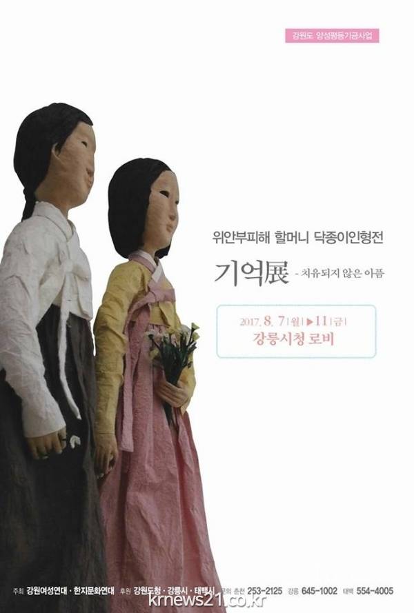 특히 이와 연계한 '위안부 피해 할머니 닥종이 인형전'이 지난 7일부터 오는 11일까지 강릉시청 로비에서 열려 그 의미를 더할 예정이다.