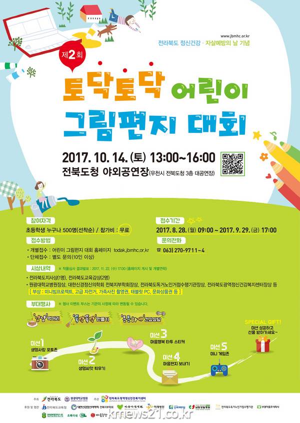 2017 세계자살예방의 날을 기념하여 전라북도 광역 정신건강 복지센터에서는 세대간의 공감대를 형성하기 위한 어린이 '토닥토닥' 그림편지대회를 실시한다.
