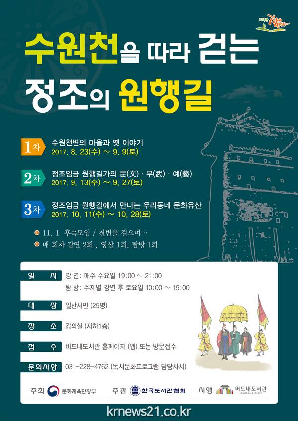 수원시 버드내도서관이 정조대왕의 원행(園幸)길 주변 마을의 역사와 문화유산을 배우고, 원행길을 탐방하는 프로그램을 마련했다.