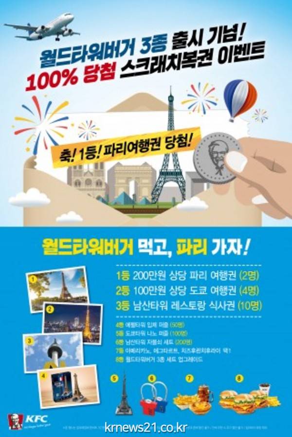 이번 출시를 기념해 당첨 확률 100%의 소비자 이벤트도 마련했다. 월드 타워버거 구매 고객 대상으로 스크래치복권을 증정, 200만원 상당 파리 여행권과 100만원 상당 도쿄 여행권, 남산타워 레스토랑 식사권, 에펠타워 및 도쿄타워 퍼즐 등 풍성한 경품을 제공할 계획이다.