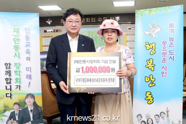 지역 인재를 육성하기 위해 설립 운영되고 있는 (재)안동시장학회에 국가무형문화재 제5호 판소리 “수궁가” 준보유자 정옥향이 8월 16일 100만원(누적금액 200만원)의 장학금을 전달했다.