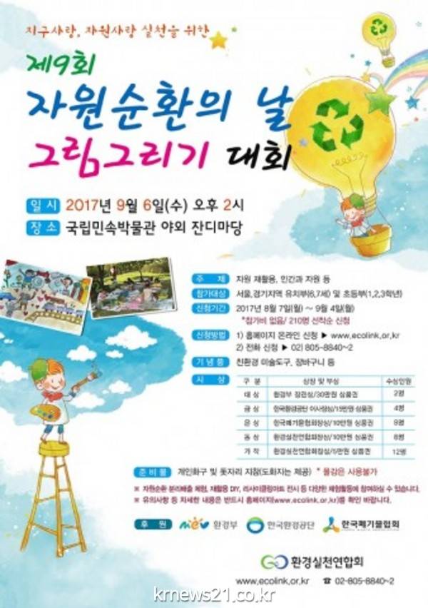 (사)환경실천연합회(이하 환실련, 회장 이경율)가 9월 6일(자원순환의 날) 국립민속박물관(서울특별시 종로구 삼청로 37)에서 ‘제9회 자원순환의 날 그림그리기 대회’를 개최한다.