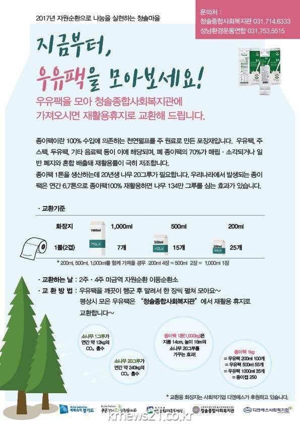 성남환경운동연합과 청솔종합사회복지관은 경기도와 사회적 기업DNS의 후원을 받아 우유팩 각 1000ml 7개, 500ml 15개, 200ml 25개를 재활용화장지 1개와 교환해주는 자원순환캠페인을 금곡동 청솔마을에서 집중전개 하고 있다.