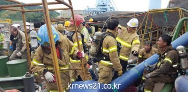21일 오전 남해지방해양경찰청과 창원해경 등 30여 명으로 꾸려진 수사본부는 사고가 난 7만4000t급 선박 내부 잔유(RO) 보관 탱크에서 국립과학수사연구원, 고용노동부 창원지청 등과 합동 감식을 진행한다.
