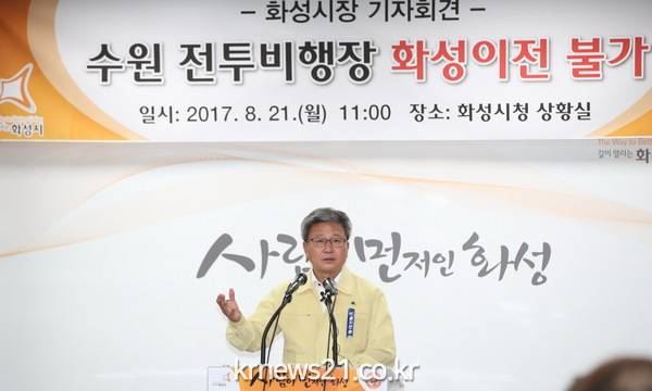 채인석 화성시장이 21일 오전 11시 시청 상황실에서 긴급 기자회견을 열고 수원 전투비행장 이전을 주장하는 수원시와 수원시 국회의원들의 행태를 규탄했다.