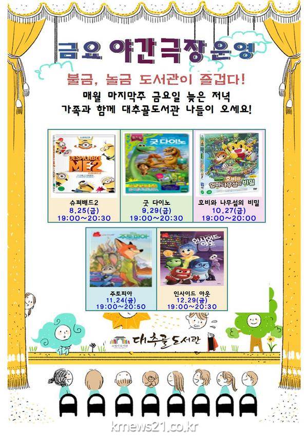 수원시 대추골 도서관이 8월부터 12월까지 매달 마지막 금요일 저녁 7시 어린이자료실에서 ‘금요야간극장’을 열고, 가족이 함께 즐길 수 있는 어린이 영화를 상영한다.