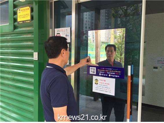 여성 공중화장실 출입구에 부착된 안심거울은 몰래 뒤 따라 오는 사람을 미러 시트지에 반사된 모습으로 확인 할 수 있어 얼굴이 공개된 범죄자의 범죄 충동심리를 억제할 수 있으며,