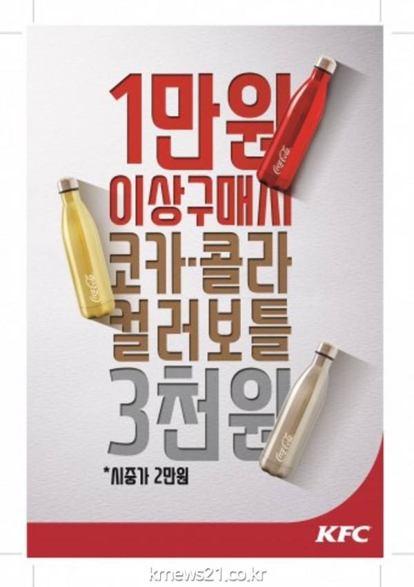 KFC는 메뉴에 관계 없이 1만원 이상 구매하는 모든 고객들을 대상으로 코카콜라 컬러보틀을 시중 구매 가격보다 85% 이상 저렴한 3천원에 구매할 수 있는 기회를 마련했다.