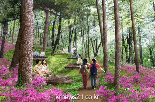이밖에도 게이트볼장이 있어 평소 어르신들이 즐겨 찾던 곳에는 철죽원과 단풍계곡원을 추가해 실버치유숲으로 변신시켜 3대가 함께 오를 수 있는 공간으로 조성한다. 특히 전망대 인근의 지형치유숲은 숲관찰원과 명상원을 조성해 주민들에게 정서적 안정을 제공한다.