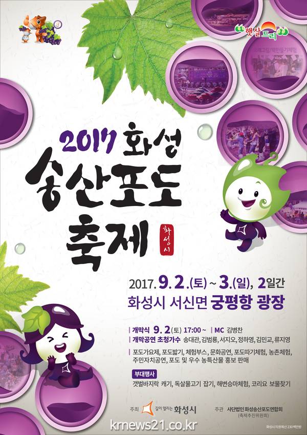 나들이하기 좋은 가을, 다양한 어촌체험도 하고 맛 좋은 포도도 맛볼 수 있는 ‘2017 화성송산포도축제’가 오는 9월 2일부터 3일까지 화성시 서신면 궁평항에서 펼쳐진다.