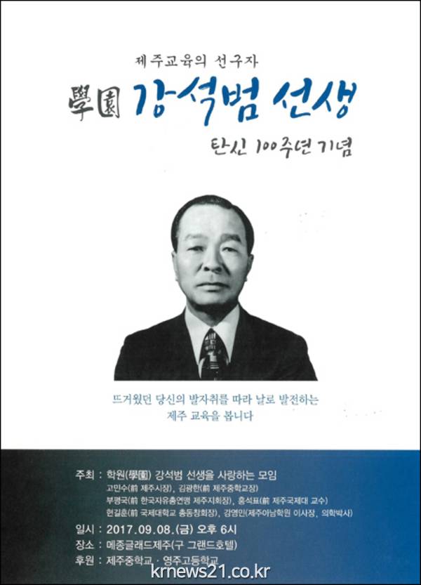 학교법인 제주아남학원은 오는 9월 8일 제주 사학의 선구자로 불려지는 강석범 선생의 탄신 100주년을 기념하는 행사를 개최한다.