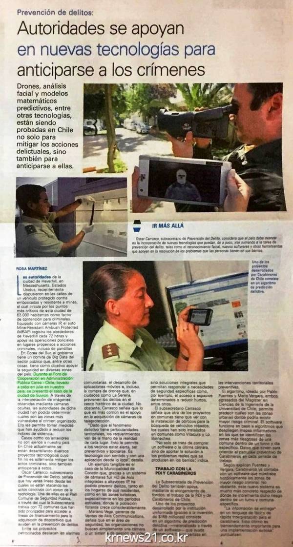 엘 메르쿠리오는 8월 17일 자 ‘범죄 예방: 경찰 당국, 범죄 예방 위해 신기술을 활용하다’라는 제목의 기사에서 칠레 경찰이 범죄 예방을 위해 도입하고 있는 다양한 신기술을 소개하면서 수원시의 범죄 예방 사례를 언급했다.