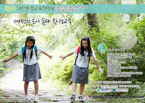 행사에서는 '대전의 도시숲과 환경교육'을 주제로 도시숲을 기반으로 한 환경교육 사례 전시회, 환경교육체험 부스, 청소년 환경동아리 사례 발표회, 도시숲 숲해설 등이 진행될 예정이다.