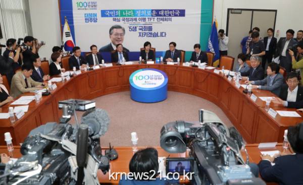 그러면서 "이번 정기국회는 적폐 청산과 나라다운 나라를 향하는 분수령"이라며 "문재인 정부의 성패가 여기 계신 TFT 단장과 간사 의원들이 정기 국회에서 어떻게 활약하느냐에 달렸다"고 강조했다.