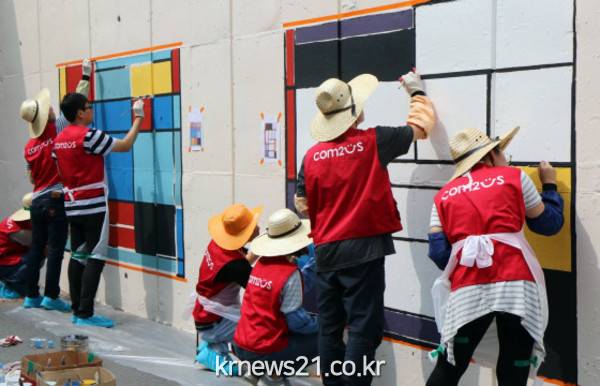 컴투스(대표 송병준)는 서울시 금천구에 위치한 시흥중학교에서 사내봉사단 컴투게더와 지역 학생들이 함께 하는 벽화 그리기 봉사활동을 지난 9일 진행했다.