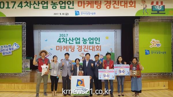 안성시농업기술센터에서 육성하고 있는 안성시사이버농업인연구회가 2017. 9. 8.(금), 경기도농업기술원에서 열린 ‘2017 4차 산업 농업인마케팅 경진대회’에서 “ICT의 선도적 활용사례” 분야에서 우수상(유형근), “UCC 팀플레이 경진 ”분야에서 우수상(김윤진, 황규현)을 각각 수상했다.