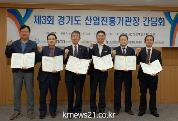 성남산업진흥재단(대표이사 장병화)은 9월 13일 부천산업진흥재단에서 안양창조산업진흥원(원장 박병선), 고양지식정보산업진흥원(원장 양유길), 부천산업진흥재단(대표이사 서동구), 시흥산업진흥원(원장 심기보), 용인시디지털산업진흥원(원장 박재신)등 경기도 지역 6개 산업기관과 함께 경기지역 산업진흥을 위한 상호 협력 양해각서를 체결했다.