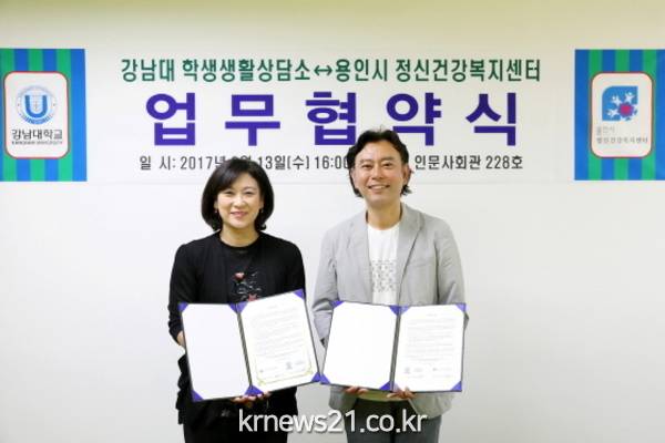 경기 강남대학교 학생생활상담소(소장 박화옥)는 13일 용인시 정신건강복지센터(센터장 박경민)와 강남대 재학생 및 용인시 지역주민의 정신건강 증진을 위한 업무협약을 체결했다.