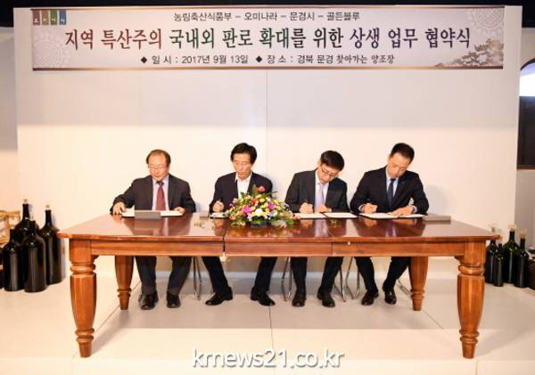 골든블루는 13일 경북 문경 오미나라에서 문경시(시장 고윤환)-농림축산식품부(장관 김영록)-오미나라(대표 이종기)와 '지역특산주 국내외 판로 확대를 위한 상생업무 협약'을 체결했다.