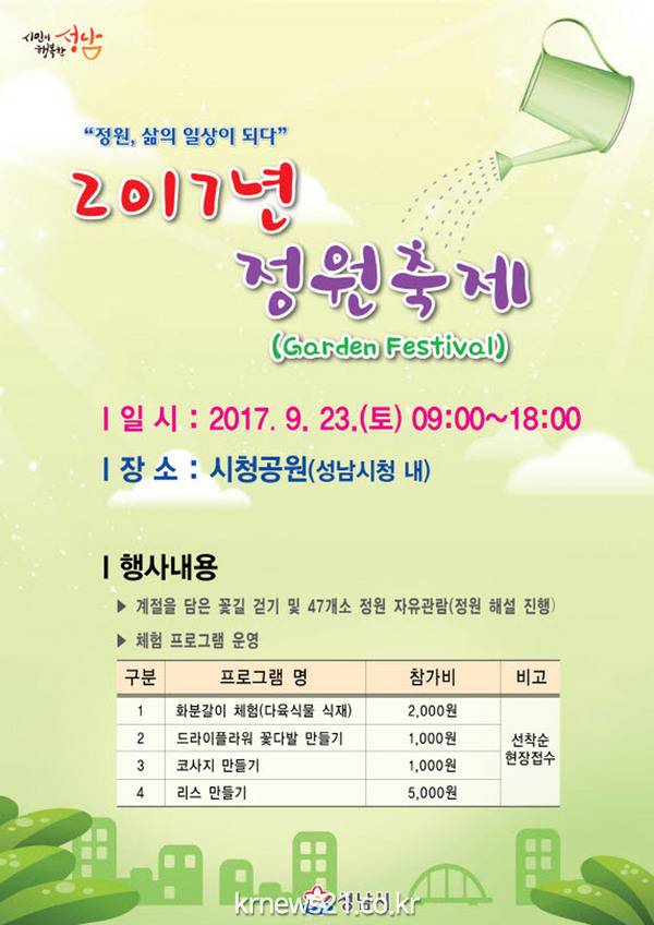 성남시(시장 이재명)는 오는 9월 23일 오전 9시~오후 6시 성남시청 공원 12만4780㎡ 일대에서 ‘정원축제(Garden Festival)’를 연다.