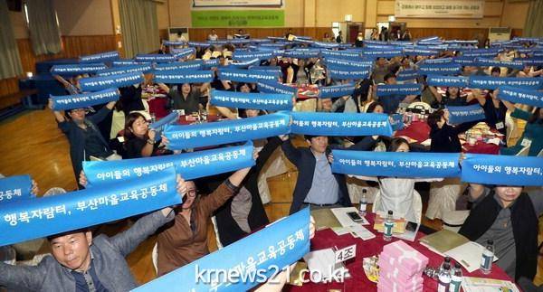 참가자들은 ▲ 아이들은 우리 사회와 미래의 주인입니다. 아이들이 행복한 학교, 아이들의 웃음소리가 넘치는 마을, 학교와 마을이 아이들을 위해 존재하도록 하겠습니다 ▲ 학생과 학부모, 마을과 학교가 협력하여 공동체적 삶의 가치를 실현하고, 지역의 문화가 살아서 공유되어 새롭게 재창조되는 부산마을교육공동체를 만들겠습니다 등을 선언했다.