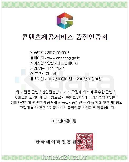 안성시는 과학기술정보통신부 및 한국데이터진흥원으로부터 ‘콘텐츠제공서비스 품질인증 마크’를 획득하였다.