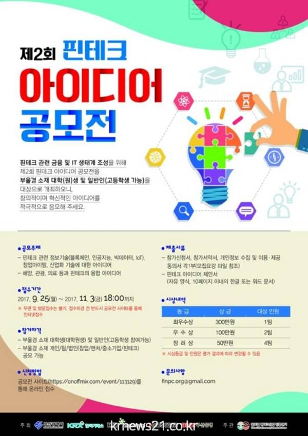 공모는 블록체인·인공지능·빅데이터·IoT(사물인터넷) 등 최신 정보기술을 활용한 핀테크 창업 아이템이나 핀테크와 해양·관광·의료 등 유망 산업간 융합아이디어 등을 주제로 한다.