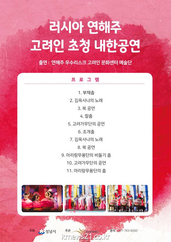 성남시는 오는 9월 28일 오후 7시 분당구 야탑동 성남아트센터 앙상블 시어터(380석)에서 ‘러시아 연해주 고려인 초청 공연’을 연다.
