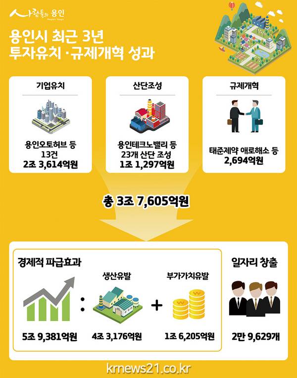 분석에 따르면 용인시가 이 기간 동안 투자를 유치한 금액은 용인 오토허브자동차서비스복합단지 등 13건의 기업유치로 2조3,614억 원, 용인 테크노밸리 등 23개 산업단지 조성으로 1조1,297억 원, 각종 규제개혁으로 2,694억 원에 달했다.