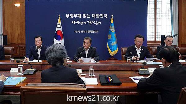 문재인 대통령은 26일 “부정부패 척결에는 성역이 있을 수 없으며 문재인 정부의 청와대도 예외가 아니다”라고 강조했다. 문 대통령은 이날 청와대에서 첫 반부패정책협의회를 주재하고 “보다 깨끗해야 할 권력이, 보다 청렴해야 할 공공부문이 고질적 부패의 늪에서 헤어나지 못했고, 국가권력을 운영하면서 부정하고 부패한 방식으로 국민 삶을 옥죄고 세금을 주머니 속 돈인 양 탕진했다”며 이같이 말했다.