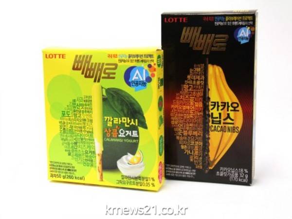 이런 데이터 분석을 통해 결과물로 나온 것이 바로 ‘빼빼로 카카오닙스’와 ‘빼빼로 깔라만시 상큼요거트’다. 두 제품 모두 건강을 추구하는 요즘 소비자들의 트렌드를 반영했으며, 인공지능 시스템을 활용한 첫 번째 제품인 만큼 제품 포장지에 AI심볼과 함께 제품이 개발된 과정을 그림으로 표현했다.
