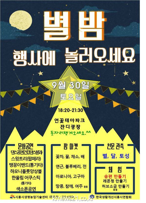 이번 행사는 ‘별 꽃 만끽! 즐거움 만끽!’이라는 주제로 여성농업인 단체인 한국생활개선시흥시연합회(회장 김창희)에서 주관하며 시흥시민을 초청하여 가을밤 문화공연과 별 달을 관측하는 야외 천문관을 운영한다.