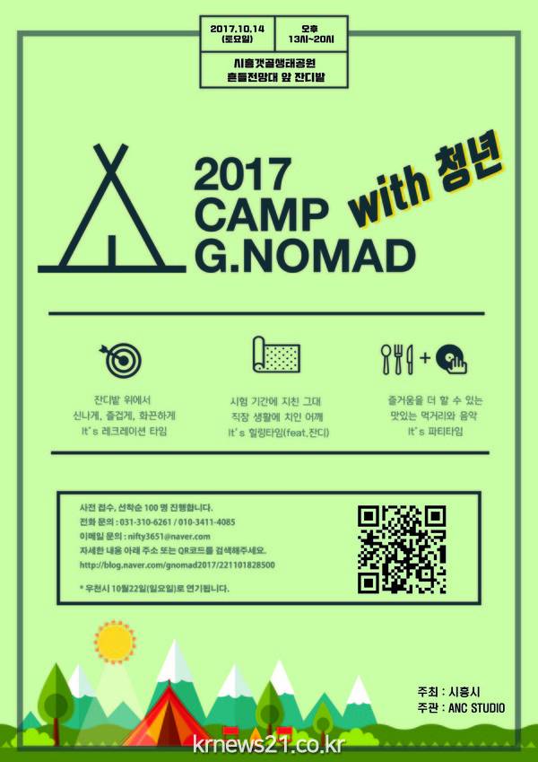 시흥시(시장 김윤식)가 도심의 일상에서 벗어나 자연에서 만나고, 자연에서 즐기기 위한 축제 <제2회 지노마드 캠프(G.Nomad Camp)>를 10월 14일 갯골생태공원에서 개최한다.